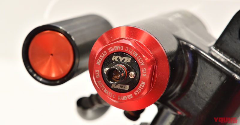 KADSの基本原理は他社のセミアクティブサスと変わらないが、その上でKADSの特徴となるのがサス本体はもちろん、ECUなどの制御系も全て内製とすること。緻密な減衰力制御を行うために、他社が開発した汎用品ではなく、自分たちの理想を追求しやすい専用部品でパッケージを固めているのだ。その他にも、コーナリング時の遠心力で検知しにくいバンク角をKYB独自の方法で検出することや、フロントフォーク内にストロークセンサーを内蔵すること、1/100秒で減衰力を変化させられる可変機構に独自構造(詳細は非公開)を採用していること……などが挙げられる。