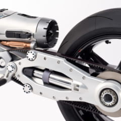 「ダイナミックに、ライダーが思う通りに走れるエキサイトメントが必要です。モーターはその特性からトランスミッションもクラッチも不要。ですが、このバイクはあえてクラッチを装備しています。アクセルによるトルクのコントロールだけでなく、クラッチでもコントロールできること、それができなくては面白くありません。メインスイッチをONにするとバイクはアイドリングし(鼓動が伝わってくるような表現だったが、モーターがアイドル回転するのかは不明)、ビルトインのサウンドジェネレーターによって音も伝わってきます。クラッチを切って回転を上げ、急速につなげばウイリーやバーンナウトだってできますよ。だって、乗って面白いのがバイクでしょう?」