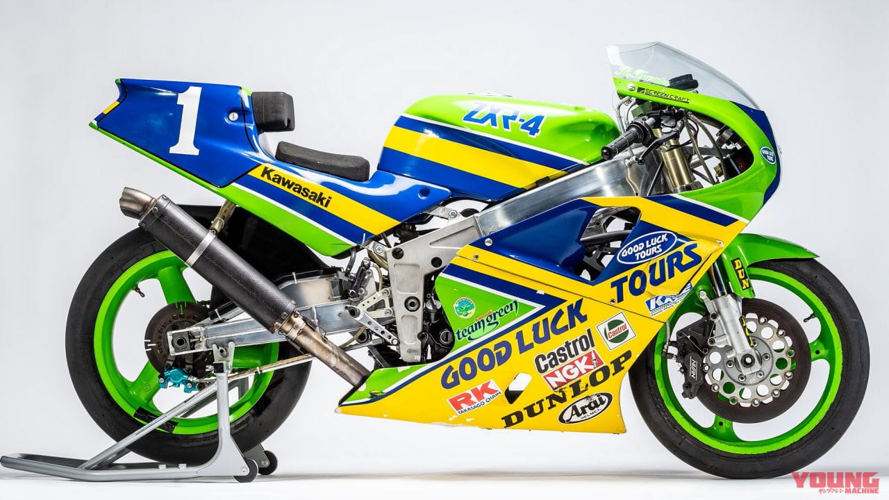 マシンの名はZXR-4 Racer。398ccの並列4気筒エンジンをアルミ製ツインスパーフレームに搭載したプロダクションレーサーで、ベースマシンはカワサキのZXR400Rだ。このマシンは1990年、全日本ロードレースにチームグリーンから参戦する鶴田竜二選手(現トリックスター代表)が走らせてTT-F3の年間タイトルを獲得している。