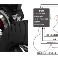 主要諸元■全長1925 全幅745 全高1105 軸距1315 シート高764(各mm) 車重135kg■水冷4スト単気筒 SOHC4バルブ 124cc エンジン[12ps/8500rpm 1.2kg-m/8000rpm] モーター[1.9ps/3000rpm 0.44kg-m/3000rpm] 無段変速 燃料タンク容量8L■タイヤサイズF=100/80-14 R=120/70-14