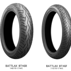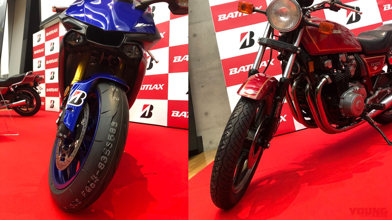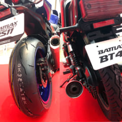 その他の変更点は多くなく、トレッドパターンも45を踏襲(装飾的な意味合いの浅い溝と「BT46」というロゴは刻まれた)するが、フロントに関しては45から前後逆向きとなる、いわゆる“逆履き”パターンへと変更。これはタイヤへの入力と同方向にトレッドを刻む、近年のBSの開発思想に沿った変更で、特に偏摩耗の抑制に効果的だという。