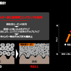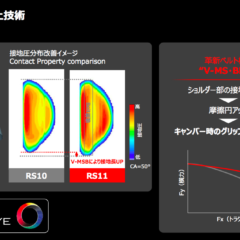 構造上の注目点は大きく2つ。RS10よりも粒子が細かく、路面にさらに深く食い込んでくれる新コンパウンドをリヤのショルダー部に採用したことと、タイヤを補強するスチールベルトの密度をショルダー部のみ粗くし、接地面をタテ方向に拡大したこと(「V-MS・BELT」という新技術)。これらにより、深いバンク角でさらに高いグリップを発揮しつつ、フロントタイヤのプロファイル変更によってより鋭いハンドリングも獲得。オートポリスのラップタイムはRS10比で1.8秒短縮しているという。サイズはフロントが120/70ZR17(58W)、リヤが190/55ZR17(75W)、200/55ZR17(78W)の計3サイズとなる。