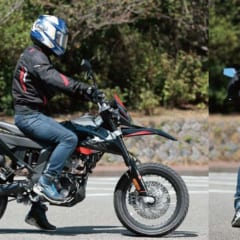 丸山「生産地は中国なんだけど、イタリアメーカーならではのクオリティがちゃんと出ている。125なんだけど、本格モタードとして落ち度なく、しっかり作られているな。それに、やっぱり高回転まで回る水冷DOHC4バルブのエンジンはパキパキしていてパワーもあるから走っていて楽しい。ヘッドライトはハロゲンなんだけど、それを入れても41万円ちょっとという車両価格はコストパフォーマンスが非常に高いと思うぞ。ABSも付いてるし」