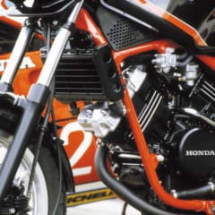 ’80年、ヤマハからハイスペックな2スト車、RZ250が登場し、爆発的ヒットを記録。翌々年、ホンダは4ストのVT250FでRZに挑んだ。4ストV4GPマシン=NR500の技術を注入したクラス初の水冷90度Vツインは、4バルブによりRZと同じ35psを1万1000rpmの高回転で発生。同じくクラス初のフロント16インチやインボードベンチレーテッドディスク、リンク式モノサスの豪華メカに加え、車体も軽快スリムとあって大ブームになった。