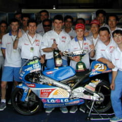東選手の大活躍に、我々としても「今年こそチャンピオンを獲る!」と意気込んでいたのは言うまでもありません。しかもこの年、ブリヂストンの契約ライダーは前年の2人から5人に増えていて、第6戦カタルニアGPではアーノルド・ビンセント選手が優勝。ブリヂストンはここまでで6勝を記録していて、1997年のどん底がウソのように好調でした。しかし全16戦を終わってみれば、第12戦バレンシアGPと第14戦南アフリカGPでジャンルイジ・スカルビーニ選手が勝利を収めて、ブリヂストンとしてはWGP最多優勝回数となるシーズン8勝を記録できたものの、東選手のランキングは3位。チャンピオンにはまたしても手が届きませんでした。
