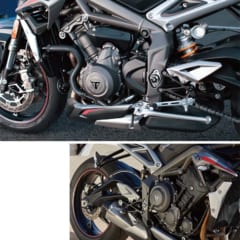 ストリートトリプルRSの、というよりもトライアンフの大きな魅力が独特のビートを刻む3気筒エンジンだ。240度の等間隔爆発がもたらすパワーフィーリングとトラクションは絶妙なもので、’17年モデル以降は排気量が675㏄から765㏄に拡大されたことによって数少ないウィークポイントだったトルクの希薄さも解消。バイク用ユニットの最適解のひとつと言えるほど、その完成度は高い。
