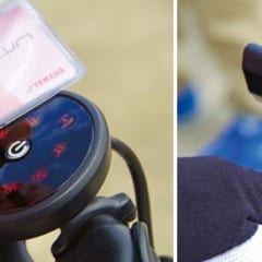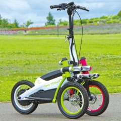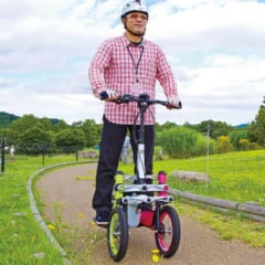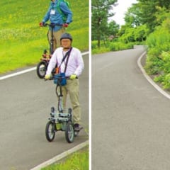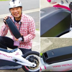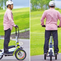 トリタウンはバイクと同じように、ライダーが自分でバランスを取って乗る構造で、自立はしない。そのため、停車時は車体が倒れないようにするロック機能が付いている。つまり走行時には「立ち乗りでライダーの体重移動が必要」な乗り物なのだ。バランスや操作は難しくなく、5分くらいで乗りこなせてしまうほど簡単だ。最高速は25km/hだが、走行音がなく風を感じながら移動できるので気持ちがいいし、一緒に走っている人と会話が楽しめるのもいい感じだ。
