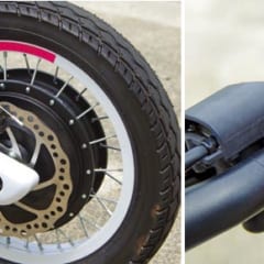 インホイールモーターを採用してモーターの搭載スペースを確保。車体にはサスペンションがないため、スポークを採用することで衝撃吸収性を向上させる狙いもあるそうだ。原付一種のヤマハE-ビーノが580Wだから、この車格で500Wのモーターは十分なスペックだ。