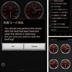 専用のアプリをインストールし、ペアリングが成功すると、まず右上のような画面が表示される。歯車をタップすると中央の画面が現れ、順を追って操作すると最後に左の画面となり、OKをタップするとエラーコードが消える。