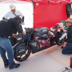 プロジェクト自体は2011年からはじまり、試作機などの製作を経て、2015年からは初号機「EV-01」でBMST(ボンネビル・モーターサイクル・スピード・トライアルズ)に参戦を開始。しかし、参戦初年度は天候不順によるコース状況の悪化で大会が中止。2016年は大会が開催されたものの、わずか数メートルを走ったところで転倒してしまう。マシンを修復して再度競技に参加するも、記録は158㎞/hにとどまる。しかし、ここで屈することなく、問題を洗い出しては改良を加えていき、2017年は248㎞/h、そして2018年は296㎞/hと記録を伸ばしていく。
