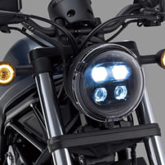 国内でも人気の高いレブル500が、より魅力を増して登場する。最大のポイントとなるのが外観。今まで電球式だったヘッド&テールライト、ウインカーがLEDとなり、精悍さが増した。特に4灯LEDのヘッドライトは、高級カスタム車を思わせる仕上がりだ。