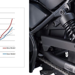 【リヤサスの仕様をグレードアップ】ショーワ製リヤショックはガス封入タイプとし、スプリングレートとダンピングラバー形状を変更。強い力が加わった際も、しっかり奥でストロークする特性となった。