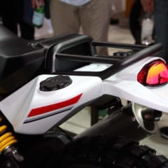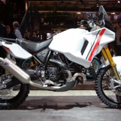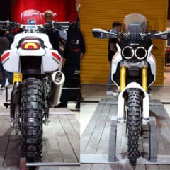 ややレトロな雰囲気の外装に、LEDリングの2眼がアピール度抜群の目を惹く1台。ベースはスクランブラー1100で、’90年代を象徴するパリダカマシン=カジバ・エレファントのイメージを投影した。当時カジバはドゥカティ製エンジンを搭載しており、その縁からオマージュされたようだ。白いカウルや赤のライン、丸眼デュアルヘッドライト、容量30Lのビッグタンクでネタ元を再現。足まわりも超本格的で、激しいオフ走行もOKだ。市販されれば”ネオクラオフ”という新トレンドを築くのでは?