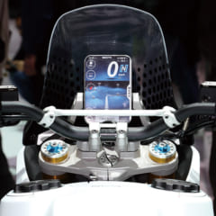 ブレースバー付きのハンドルに、ラリーレイド風の縦長メーターを組み合わせたコクピット。メーターはスマホをマウントしたようなデザインで、ナビなど様々な情報を示す。スマホが活用できれば便利だが、果たして?