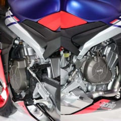 RSV4 1000のV型4気筒を活用した新設計パラツイン。低コストと高性能を両立させる大胆な手法だ。爆発間隔は270°で、鼓動感やトラクション性能を狙った。後半部を省略したアルミフレームも特徴的。