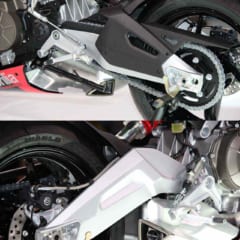 左右非対称のアルミスイングアームはエンジンに直接マウントしたピボットレス構造。リヤサスは非リンク式だ。双方向対応クイックシフターも完備。