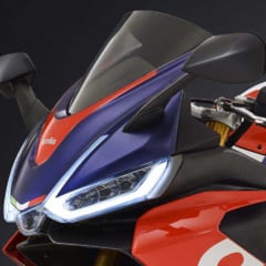 RSVシリーズらしい3眼ライトの顔。灯火類はフルLEDで、なんとコーナリングライトまで備える。鮮烈なデイライトが両目をフチどり、その下に導風版を配置する。