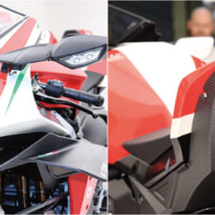 ホワイト×レッドのカラーリングはビモータの定番で、’73 年発表の第1号車・HB1(CB750Fourエンジン搭載)以来、数多くのモデルが採用。ボディの左右に備わるカーボン製ウイングは、フェアリングに後付けしたパーツではなく、エアインテークと一体成型。