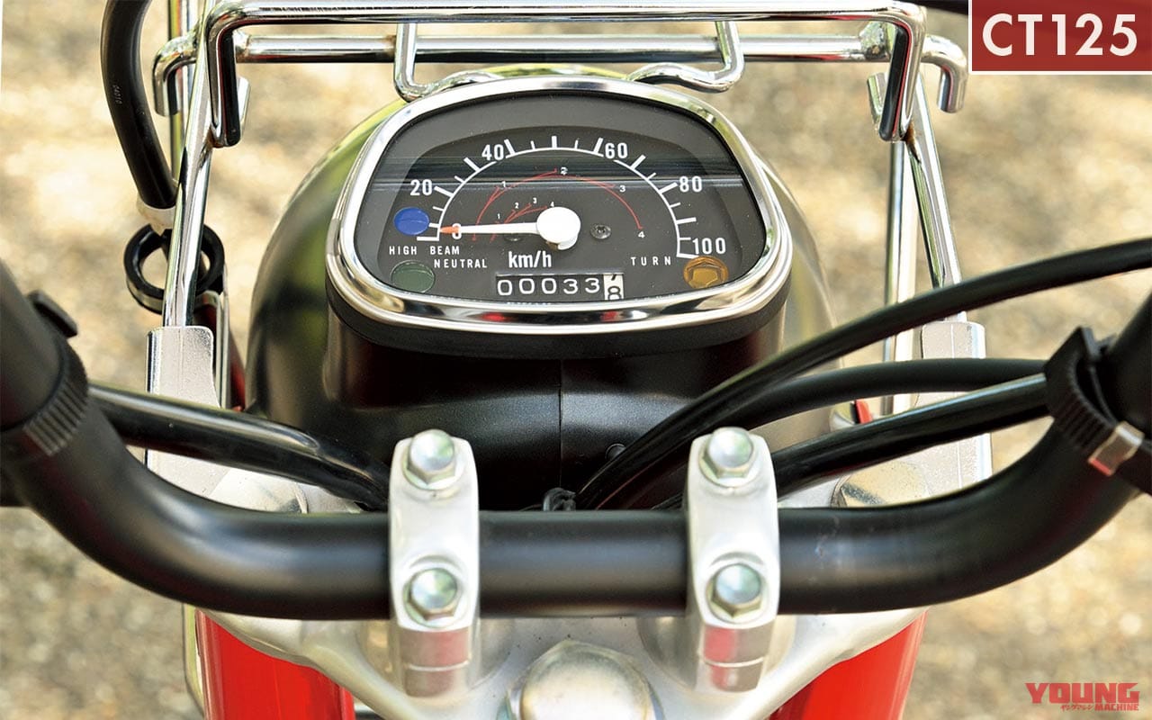 CT125は、メーターを左側にオフセットして設置。残念ながら完全にモックアップ状態で文字盤を確認することはできなかった。ケースやインジケーターの配置はモンキー125と似ているが、若干異なる模様。ケーブルは見あたらず、電気式のようだ。一方のCT110はヘッドライトケースと一体式。シンプルな完全アナログ仕様で、速度とオド、警告灯、ニュートラルランプ、ハイビームランプのみの構成だ。ちなみに郵政仕様のCT110は別体式メーターを採用する。