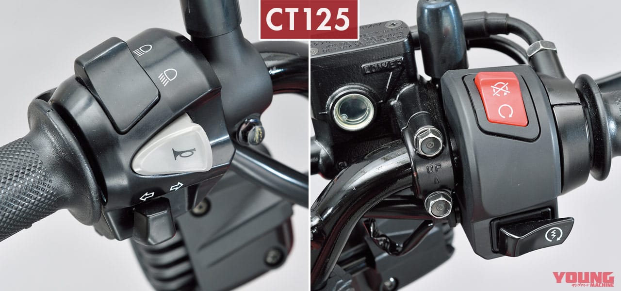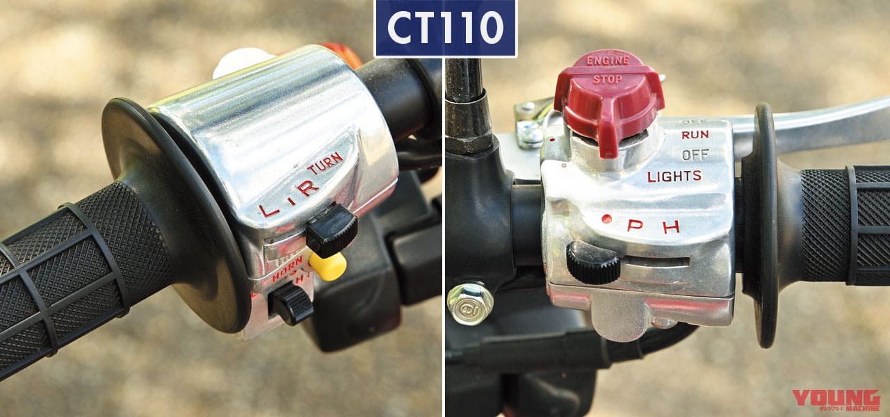 CT125の左右スイッチボックスは、近頃のホンダ車が採用する標準的な仕様。ハザードスイッチなどは備えない。一方のCT110は、’80年代から受け継がれるメッキ式ボックス。右側に懐かしい回転式キルスイッチやライトの点灯スイッチを備える。