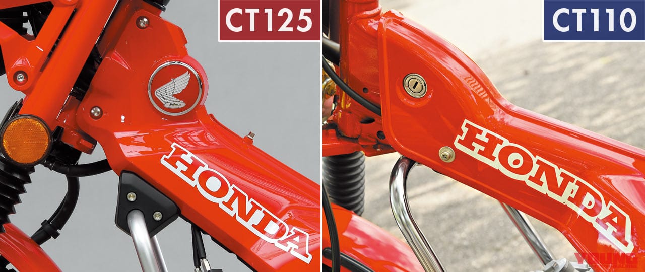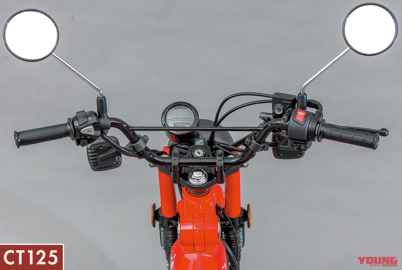 CT125・CT110ともに、オフ車らしいアップハンドルで黒塗装が施されている。CT125は流行のブレースバーを備え、デジモノなどのマウントにも便利。CT125はトップブリッジ上にメインスイッチがあり、ベースとなるスーパーカブC125のようなスマートキーは非装備のようだ。CT110はセンターフレーム左横にメインキーが設置されている。