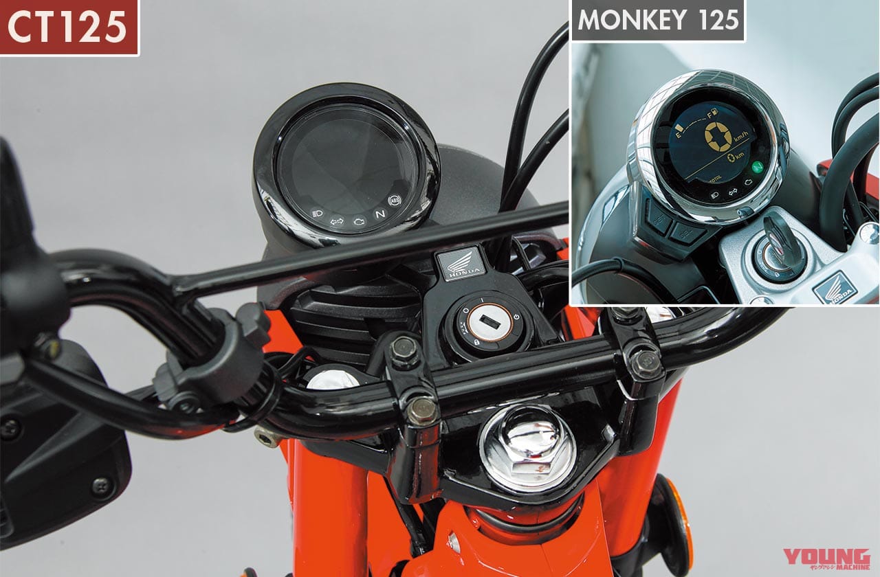 ’19年9月に発表され、その後の東京モーターショーでも大きな話題を集めたホンダのコンセプトモデル「CT125」。前稿のシャーシ・足まわり編に続き、本稿ではメーターやキャリアなどの実用アイテムや、ステップなどの操作系といった装備面を比較する。コンセプト車ながらも、CT125はきっちりと造り込まれており、細部に至るまでぬかりはない。