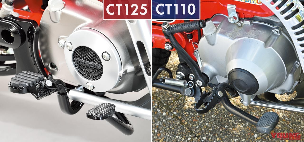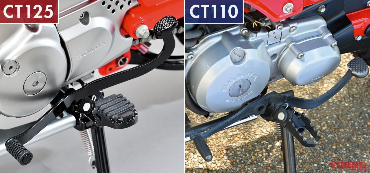CT125のステップはラバーを外せば、110と同様、スパイク状のオフロードステップになる構造。シーソー式のシフトペダルは、きちんとラバーを巻いてあり、造形も110と酷似している。右ステップ周辺には、リヤディスク用の油圧系統を新設しながら、カブシリーズの伝統的なブレーキペダルを踏襲しているのがポイントだ。ちなみに125はキックペダル非装備だが、「豪州向けには標準で装備されるかも。あちらでは緊急用として採用されるケースが多いです」(CT専門店モノチリンドロ・夏川社長)