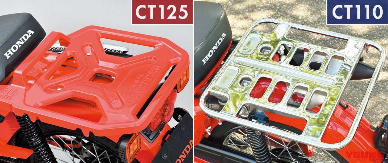 CT125の大型キャリアは新設計。車体同色で、十字の凹凸がポップな雰囲気を醸し出している。両サイドに荷掛けフックとなる切り欠きを設け、前方にはセンスタを掛ける際の持ち手を配置。後端に「TRAIL HUNTER」の文字を刻む。CT110の方はカブより大型のメッキ仕様で実用性重視。