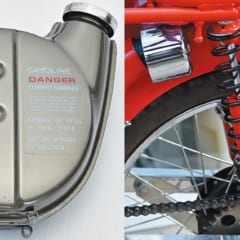 (左)サブタンクキット(4万2790円)は数あるオプションの中でも一番人気。なおCT125でも「北米、豪州仕様にアクセサリーとして設定されるのでは?」とのこと。国内でもガソリンを入れなければ装着自体は可能だ。他にもエンジンから足まわりまで、かゆい所に手が届くパーツが揃う。(右)カヤバに限定ロットでオーダーしているCT専用のオリジナルリヤショック(5万6100円)。ボディ同色の上に乗り心地もアップする。POSTモデル用フォークもあり。