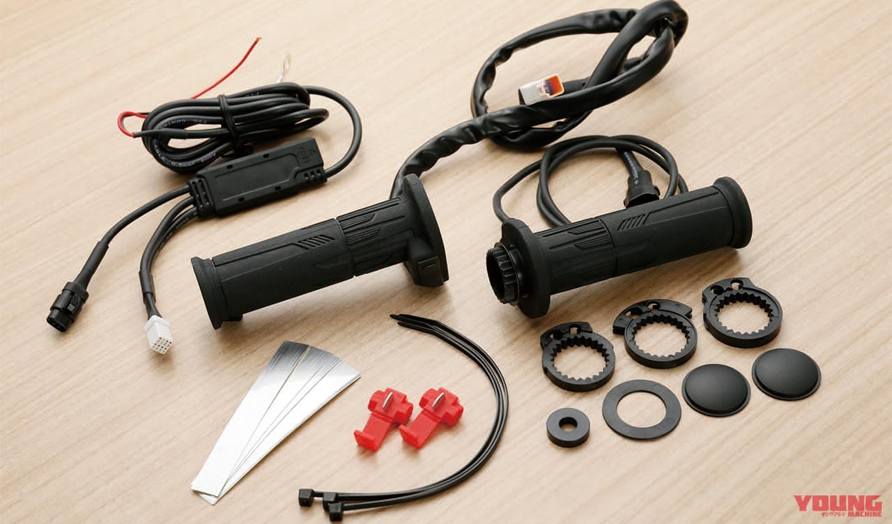 グリップヒーターGH10[キジマ]一般的なハンドルパイプ径Φ 22.2mmに対応。グリップ長は120mm用と130mm用の2タイプがある。エレクトラタップやスペーサーなど取付に必要な小物類も同梱。●対応ハンドルパイプ径:Φ22.2mm、グリップ長:120mm/130mm ●価格:1万7600円