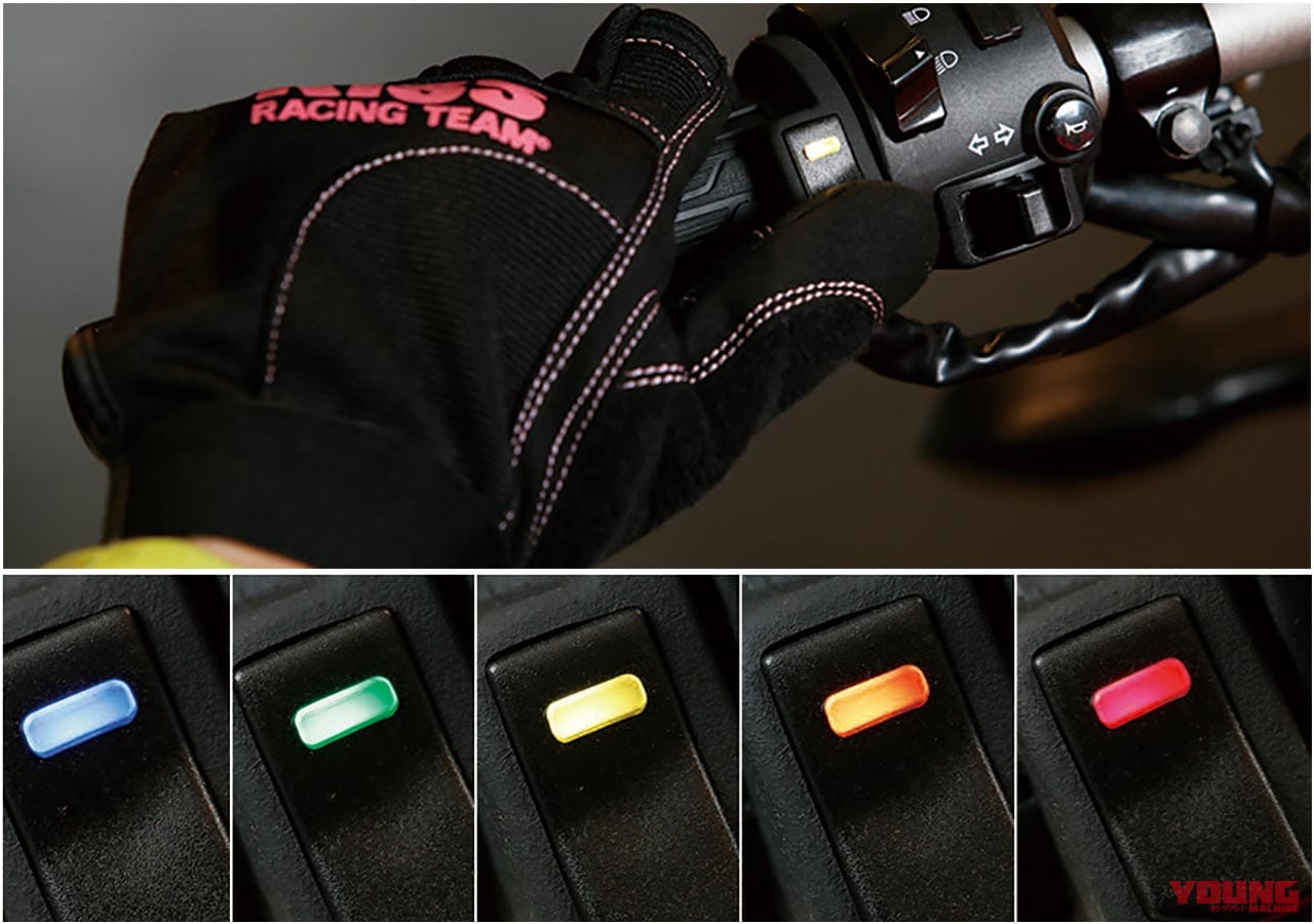 グリップ内は全周ヒーターが内蔵され、左グリップのスイッチで5段階+OFFに温度調整可。作動後すぐに温度が上昇するので、ツーリングはもとより朝の忙しい通勤時にも便利なアイテムだ。