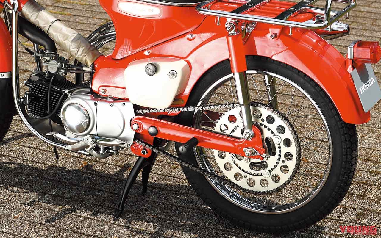 90ccの排気量に加え、ショート側のスプロケットはウイリーするほど低速が力強い。当時のカブと比べてもパワフルさは随一だ。
