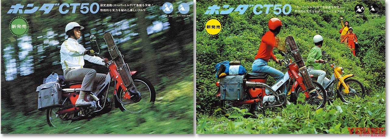 販売不振に終わったC100Hから久々に復活した国内仕様。スーパーカブC50がベースで、CTとして唯一のゼロハンとなる。’67CT90譲りの副変速機を国内バイクで初採用し、3速ロータリーの減速比をハイ&ローに切り替え可能。抜群の登坂力を示したが、時代が早すぎたせいか約1年で生産終了した。