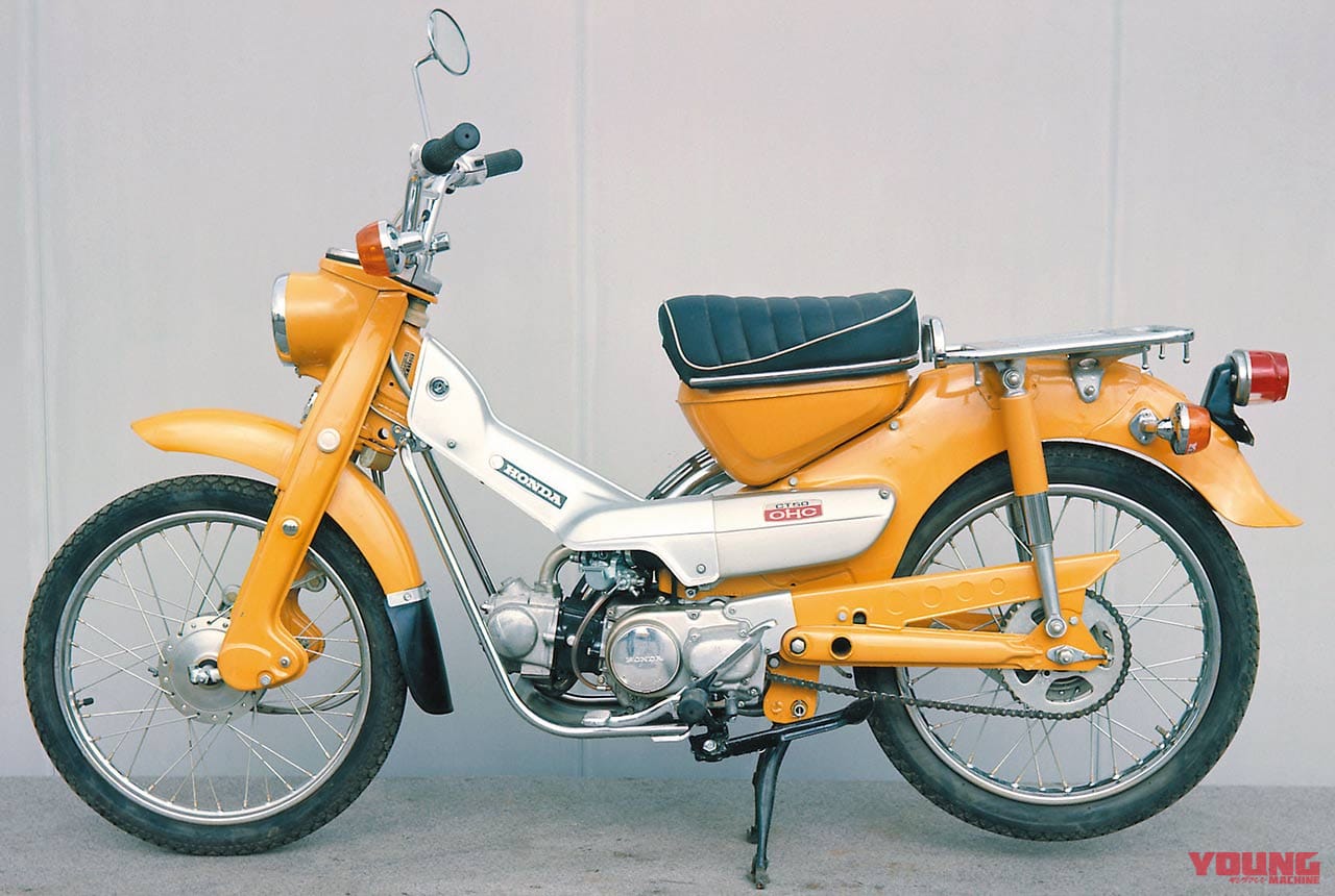 ライバルに対抗すべく、’63年に登場したスーパーカブC200のパワフルなOHV87ccユニットを搭載。4段変速に自動遠心クラッチを追加し、CM90ベースのアンダーボーンフレームに搭載した。アップマフラーやWリヤスプロケを踏襲しながら、エンジンガードを兼ねたサブフレームをはじめ、アップフロントフェンダー、可倒式ステップなども新たに投入。トレールバイクとしての適性を一段と高めた。現代まで続く「CT」の名を初めて冠したモデルとなり、’66年まで販売。