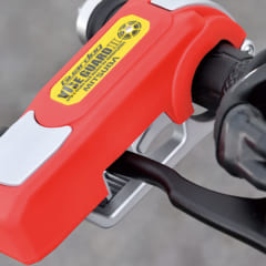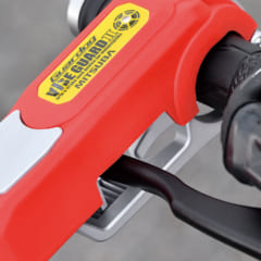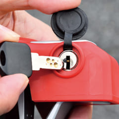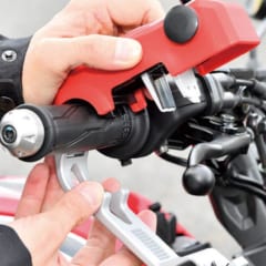 ’12年に発売、’17年にグリーンを追加するなど、ロングセラーとなっているミツバサンコーワのバイスガードⅡ。ブレーキレバーを引いた状態でロックするので車両の移動が困難になり、さらにスロットルも回せないので配線を直結しても駆動力が使えない。さらに、傾斜センサーによる盗難抑止アラームも内蔵しているので、破壊も困難というわけだ。