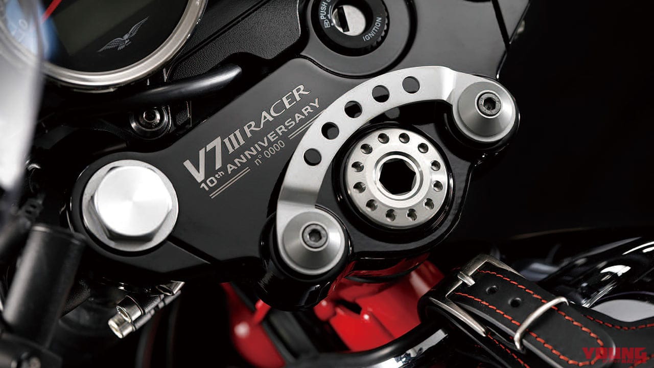 ネオカフェレーサー人気の鏑矢となったV7レーサーの誕生10周年を記念するモデル。赤いセンターストライプの入ったビキニカウルと、そこに入るヘッドライトをはじめとしたフルLEDの灯火類、新型バーエンドミラー、薄くて滑らかなリアマッドガードといった専用装備が奢られている。