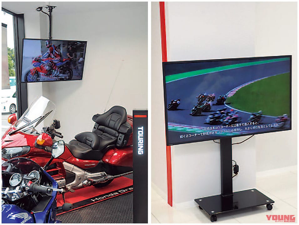 チラシやポスターを省いて店内をスッキリさせるためデジタルサイネージ化が進んでいました。店内には大型モニターが3 台設置され、ホンダドリームの施策説明やイベント映像が流れていました。