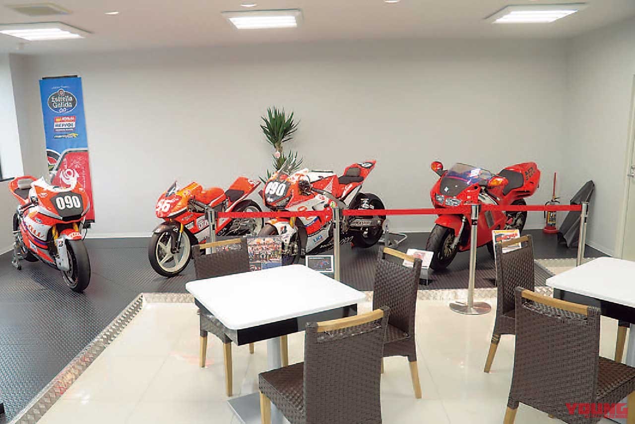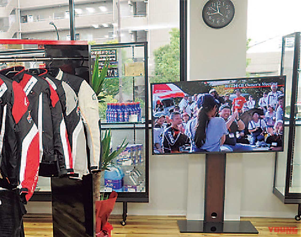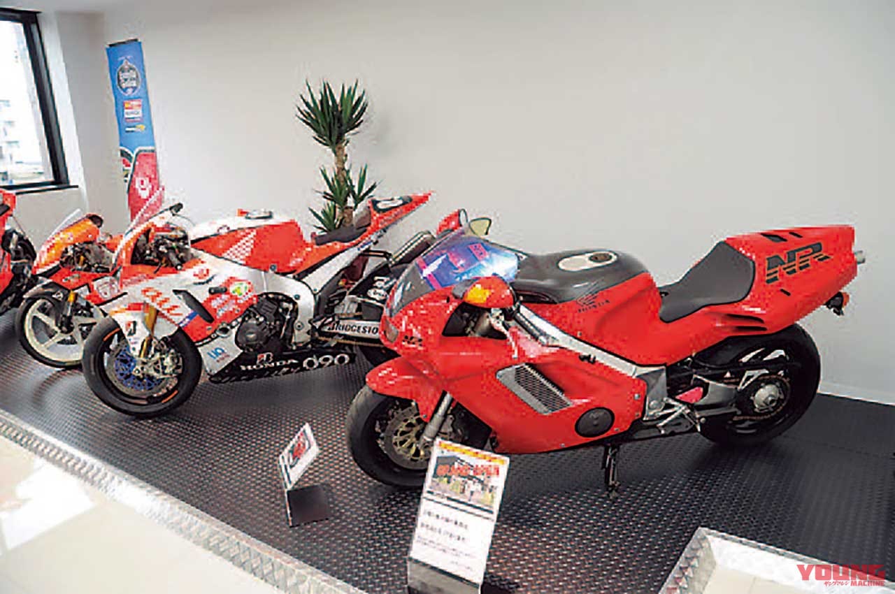 店舗2Fのコミュニケーションスペースには鈴鹿8耐や全日本選手権で活躍したマシンのほかにNR750や2ストレーサーなどのレア車も展示されていました。
