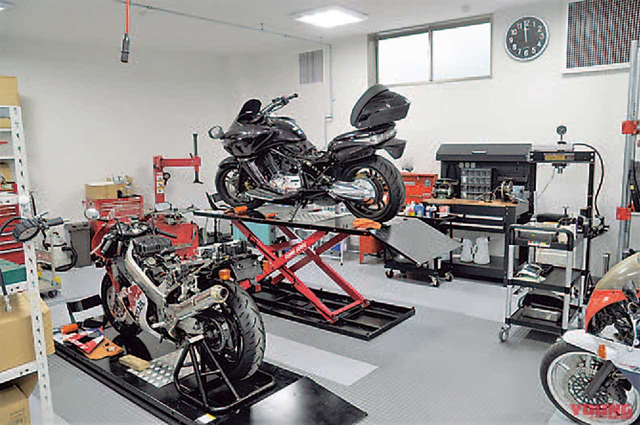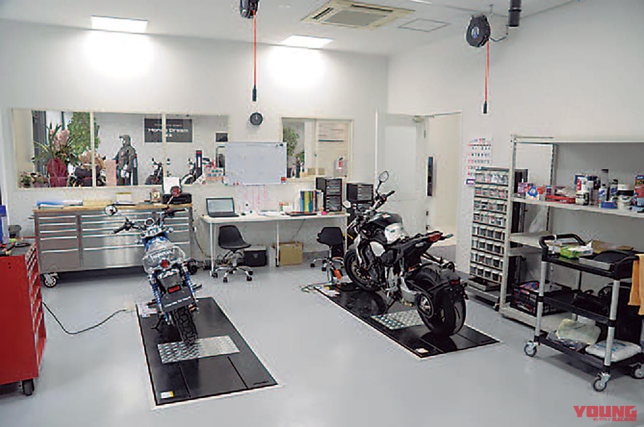 ショールーム横のピットスペースは、レーシングマシンの整備室のように清潔で最新設備が揃っています。こんなピットで作業してもらえると、愛車も喜ぶはず!