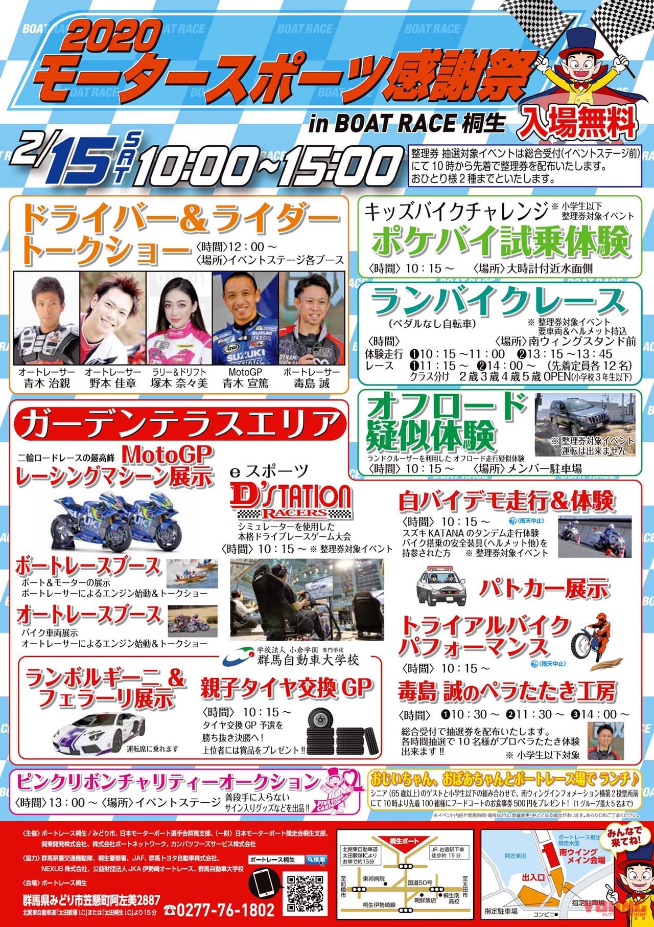 シーズンインを控え、セパン・インターナショナルサーキットにおけるモトGP公式テストも終わった頃、群馬県みどり市にある「ボートレース桐生」にてモータースポーツイベントが開催される。その名も「2020モータースポーツ感謝祭 in BOAT RACE桐生」は、青木宣篤さんほか青木さんと親交のあるオートレーサーやボートレーサー、ラリー&ドリフトドライバーが集結するイベントだ。