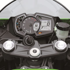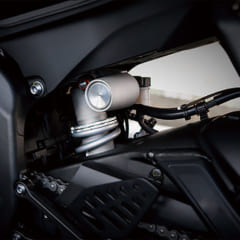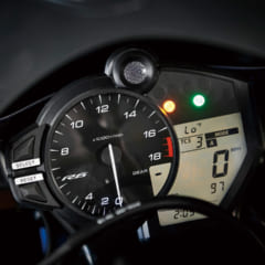 【シフトタイミングも万全】メーターはアナログタコと液晶の組み合わせ。レッドゾーンはライバルZX-6Rより500回転高い1万6500rpm。6000rpmの位置に「R6」のロゴを配置するのがユニークだ。アップ対応のクイックシフターを標準採用し、タコメーター内の液晶部にギヤ段数、上部にシフトタイミングランプも備える。