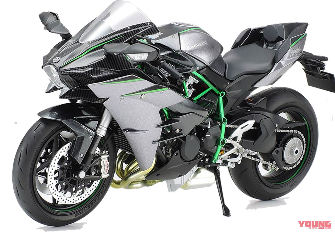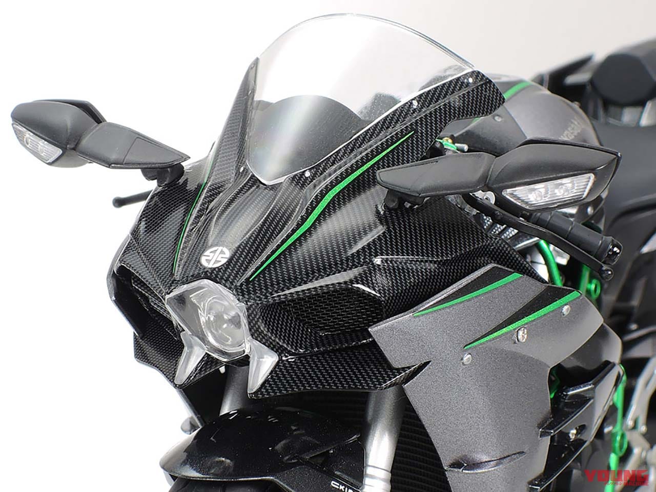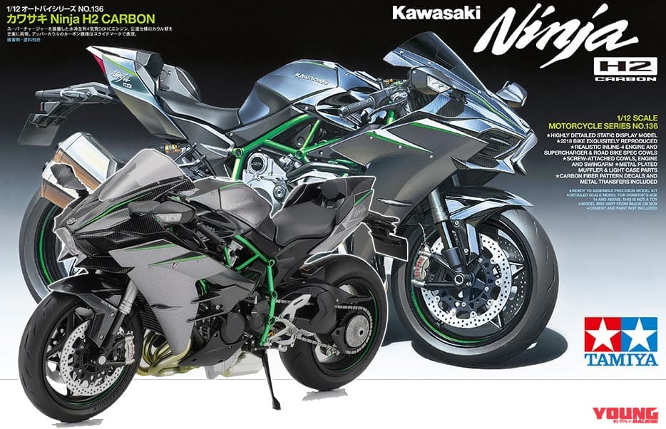 ’14年のミラノショーで発表され、翌’15年に200馬力を引っ提げて登場したカワサキ Ninja H2。そのH2の上位グレードにあたる「Ninja H2 CARBON」の2018年型を再現した1/12スケールのプラスチックモデル組み立てキットが、タミヤより発売される。