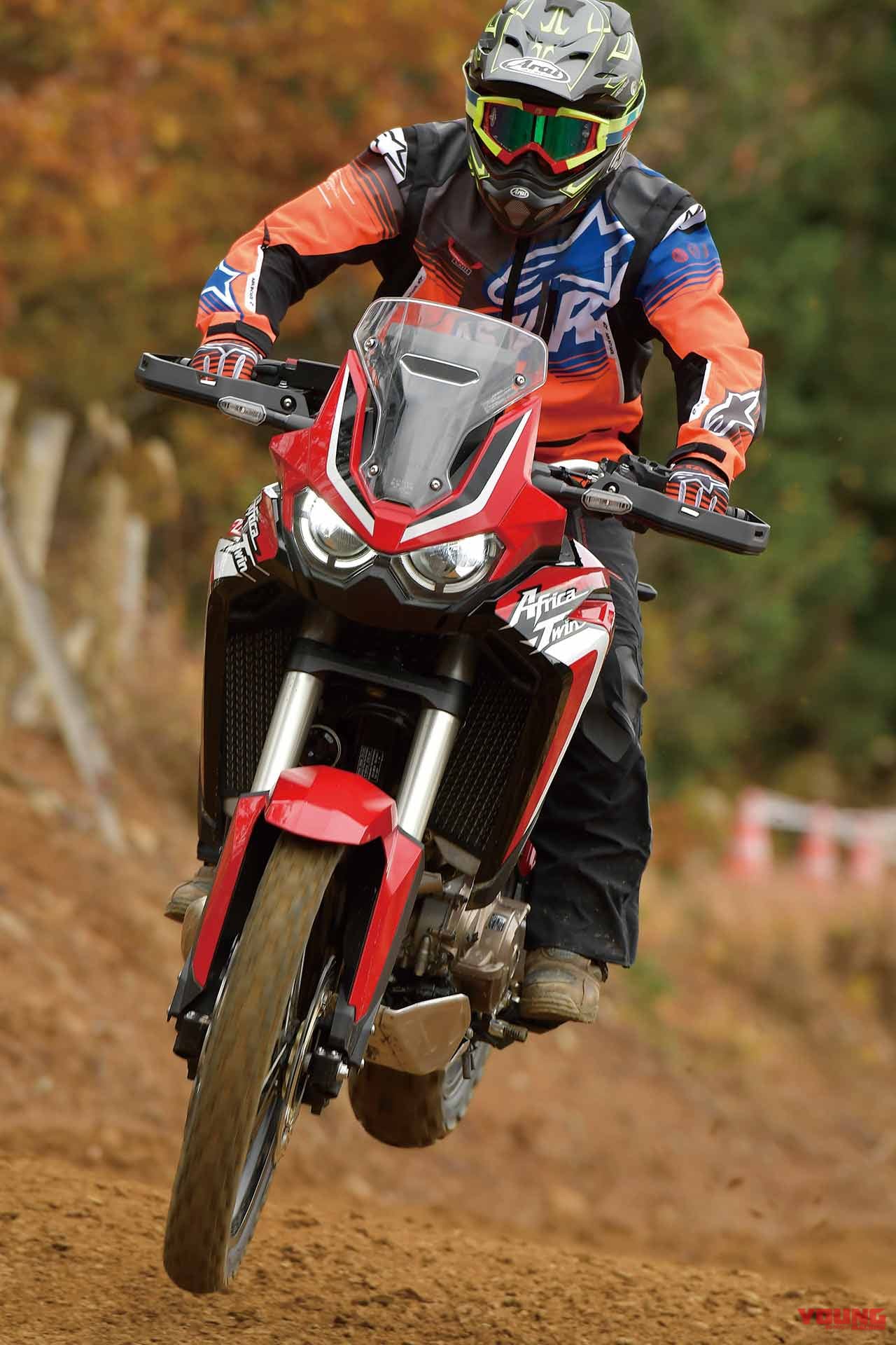 ES仕様のタイプ設定がないノーマルアフリカツイン。ストローク185mmの標準仕様は、スプリングが2段レートとはいえジャンプで使い切る印象。ガンガン攻めるタイプならロングストローク仕様がオススメだ。