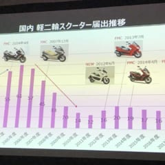 2005年をピークに軽二輪スクーターは激減し、2011年を底に増減を繰り返しながら、少しずつ盛り返してきている。ADV150はこれをさらに一歩進める可能性を秘めているのだ。ちなみに、軽二輪クラスではスクーターが最大勢力だという。