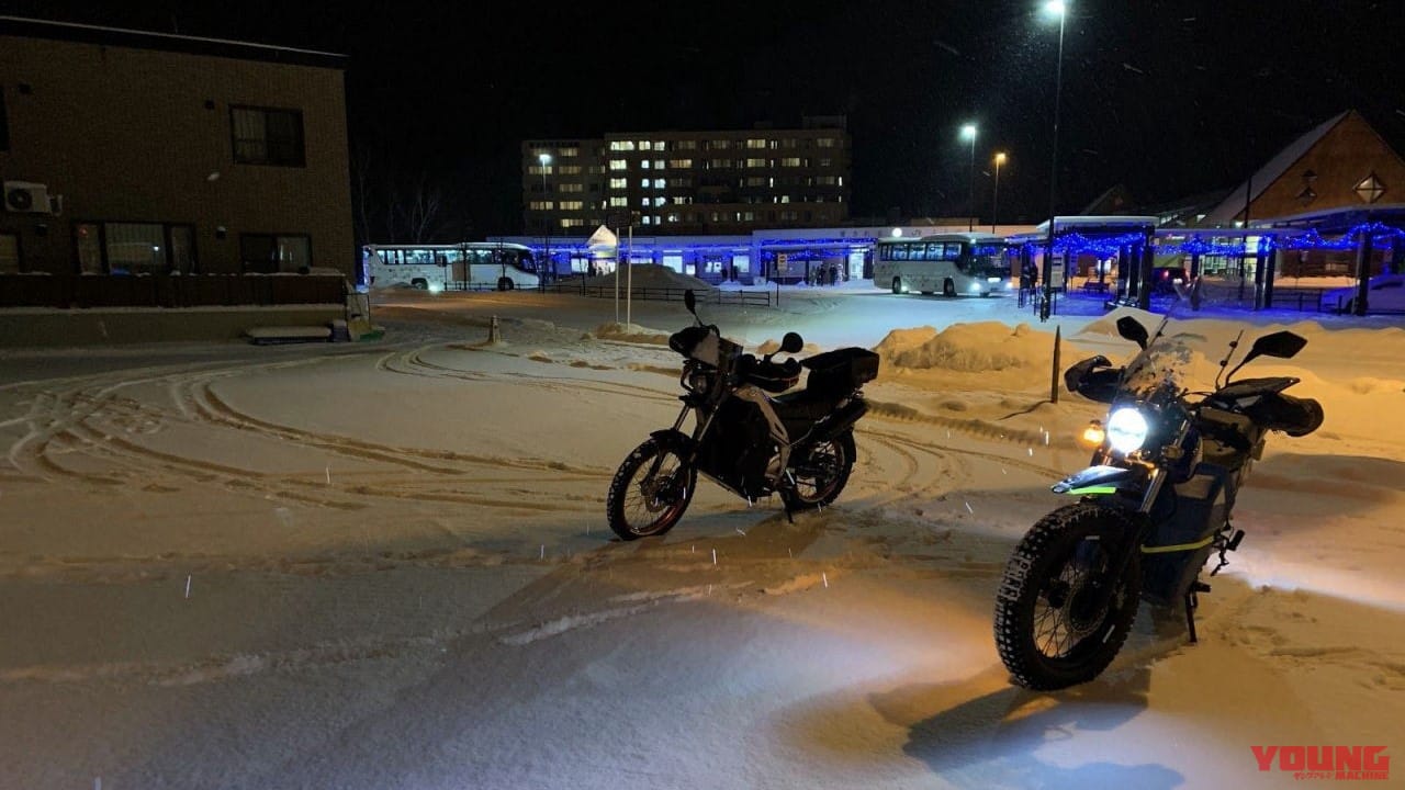 真っ暗な闇夜、そしてヘッドライトに照らされる白い路面。新雪を苦手とするデュアルパーパスタイヤをはくミュルサンヌ奥津氏のトリッカーのペースがあがらず距離が離れる。