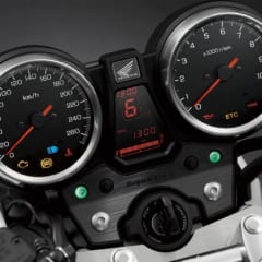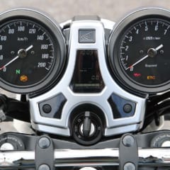 指針式のスピードメーターとタコメーターの間にギヤポジションや燃料計、時計などを表示するデジタル部をセット。ここには、グリップヒーターやETC車載器のインジケーターも組み込まれている。