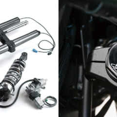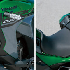 (左)SEには、車体の傾きに応じて照射範囲の変わる3段階コーナリングライトが標準装備。カウルサイドの左右に組み込まれている。(右)高剛性のリヤフレームは、純正アクセサリーのパニアケースとトップケースを同時に取り付けることが可能。高い積載能力を誇る。