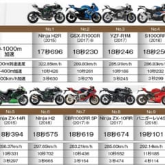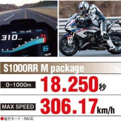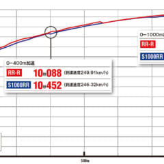 【中回転域の差がタイムに!?】同じ環境でテストしたRR-RとS1000RRの結果を比べると、0-100km/h加速(スタートから50mほど)でついた約0.34秒の差が、その後の結果に影響しているように見える。中回転域の出力特性に優れるRR-Rが先行し、高回転域出力では互角のS1000RRが粘った。
