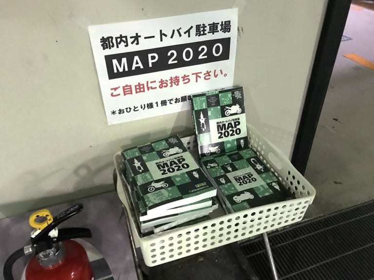 公社駐車場の一角に置かれて無料配布されていた「都内オートバイ駐車場MAP2020」。全557件収録で、2019年版からは5件増えていた。
