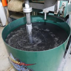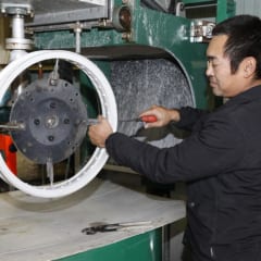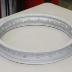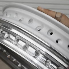 H型断面のアルミリムなので研磨メディアが内壁側に入りにくい条件となる。そこで、回転研磨角度や首振りスライド機能のティーチング条件を変更しつつ、本格的な磨き作業に入った。最初は粗めのメディアで仕上げ、次にBB弾のような仕上げメディアを利用。